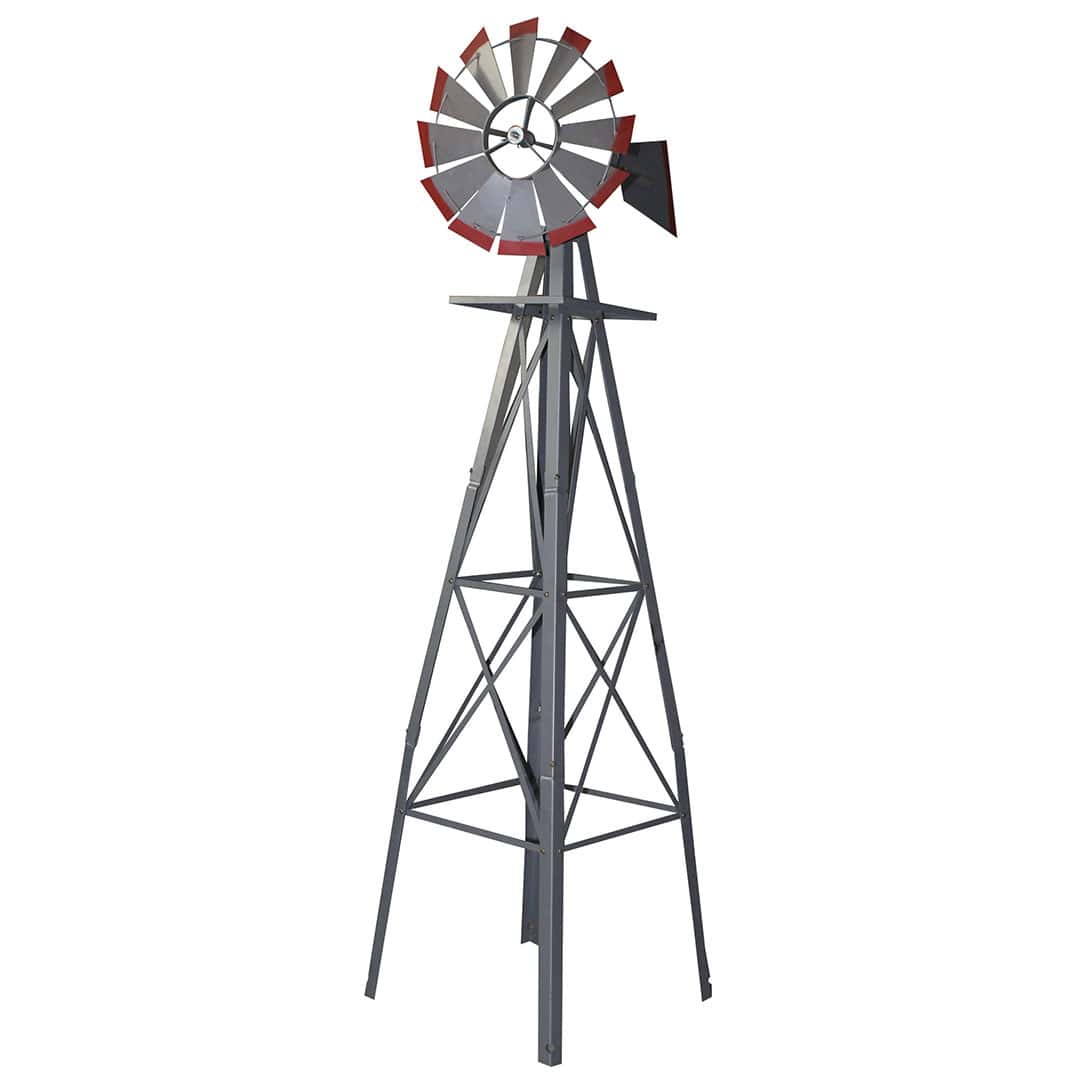 This ornamental garden windmill is a great way to add charm to your garden and give it an outback country feel. These windmills are constructed from metal ensuring maximum strength and durability. The windmills stands 1800mm high and has a 480mm fan. The fan rotates in the lightest breeze due to the tail blade keeping the fan facing into wind and the ball bearing rotation system. The windmill includes four ground stakes for securing the windmill to the ground.