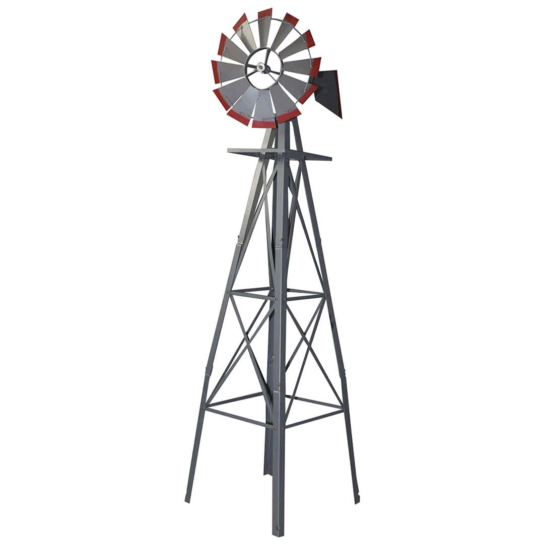 This ornamental garden windmill is a great way to add charm to your garden and give it an outback country feel. These windmills are constructed from metal ensuring maximum strength and durability. The windmills stands 2400mm high and has a 550mm fan. The fan rotates in the lightest breeze due to the tail blade keeping the fan facing into wind and the ball bearing rotation system. The windmill includes four ground stakes for securing the windmill to the ground.